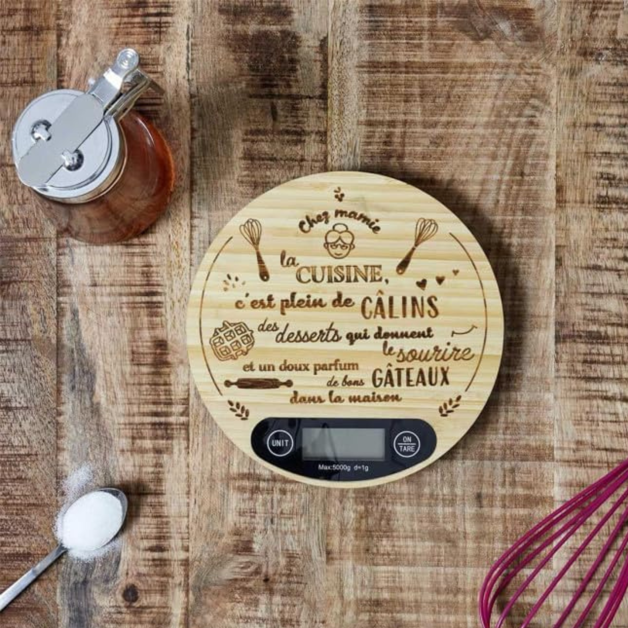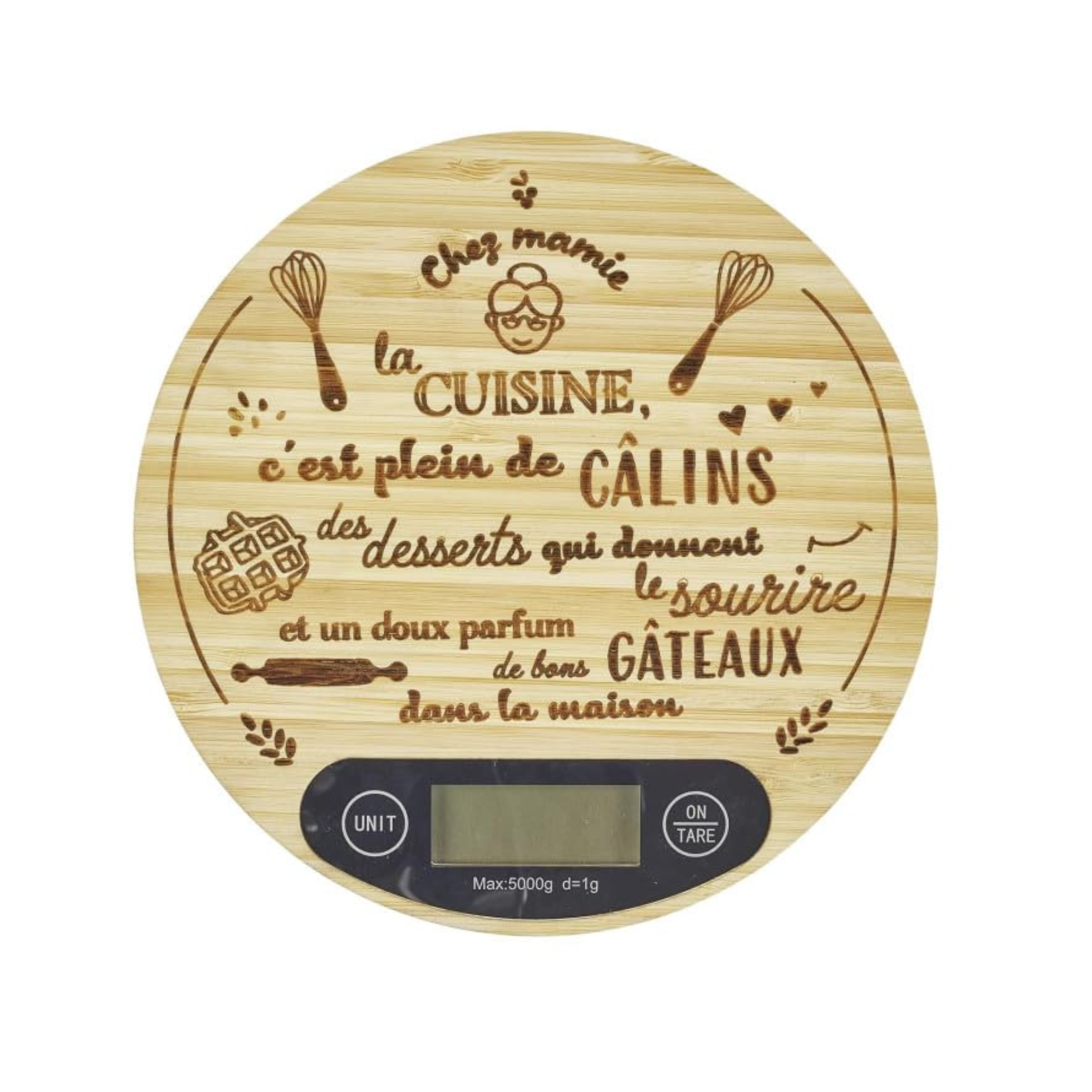 Alliez précision moderne et charme authentique avec cette balance de cuisine digitale au plateau en bambou véritable. Conçue pour les passionnés de pâtisserie et de cuisine faite maison, elle arbore une gravure thématique célébrant la chaleur de la cuisine traditionnelle, tout en offrant des performances technologiques de pointe.