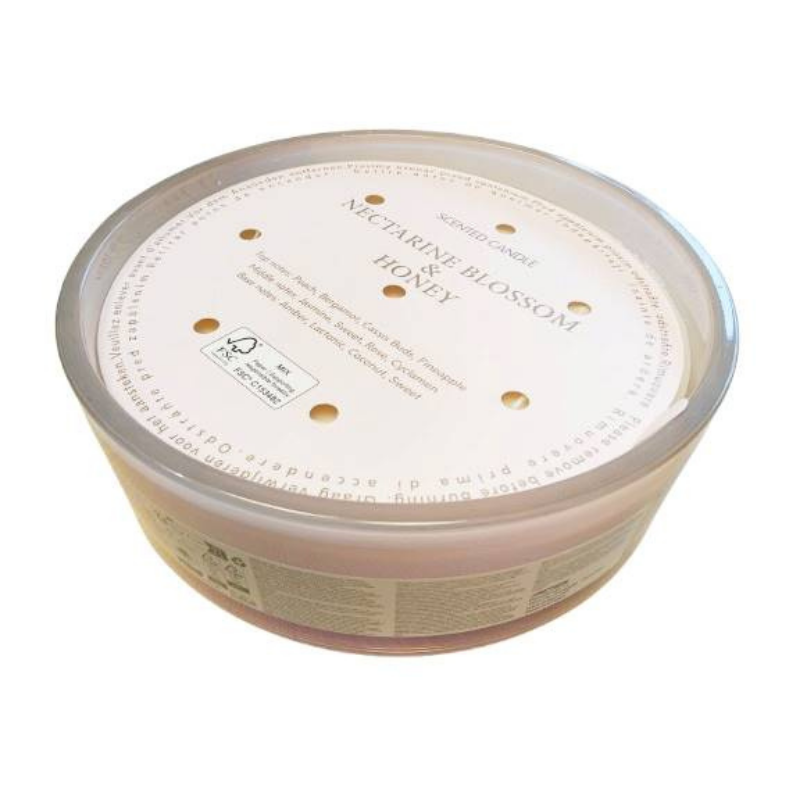 La bougie parfumée 7 mèches en verre crée une atmosphère chaleureuse et enveloppante dès son allumage. Son parfum délicat de fleur de nectarine et de miel, à la fois fruité, floral et légèrement sucré, embaume votre intérieur sans jamais être entêtant.